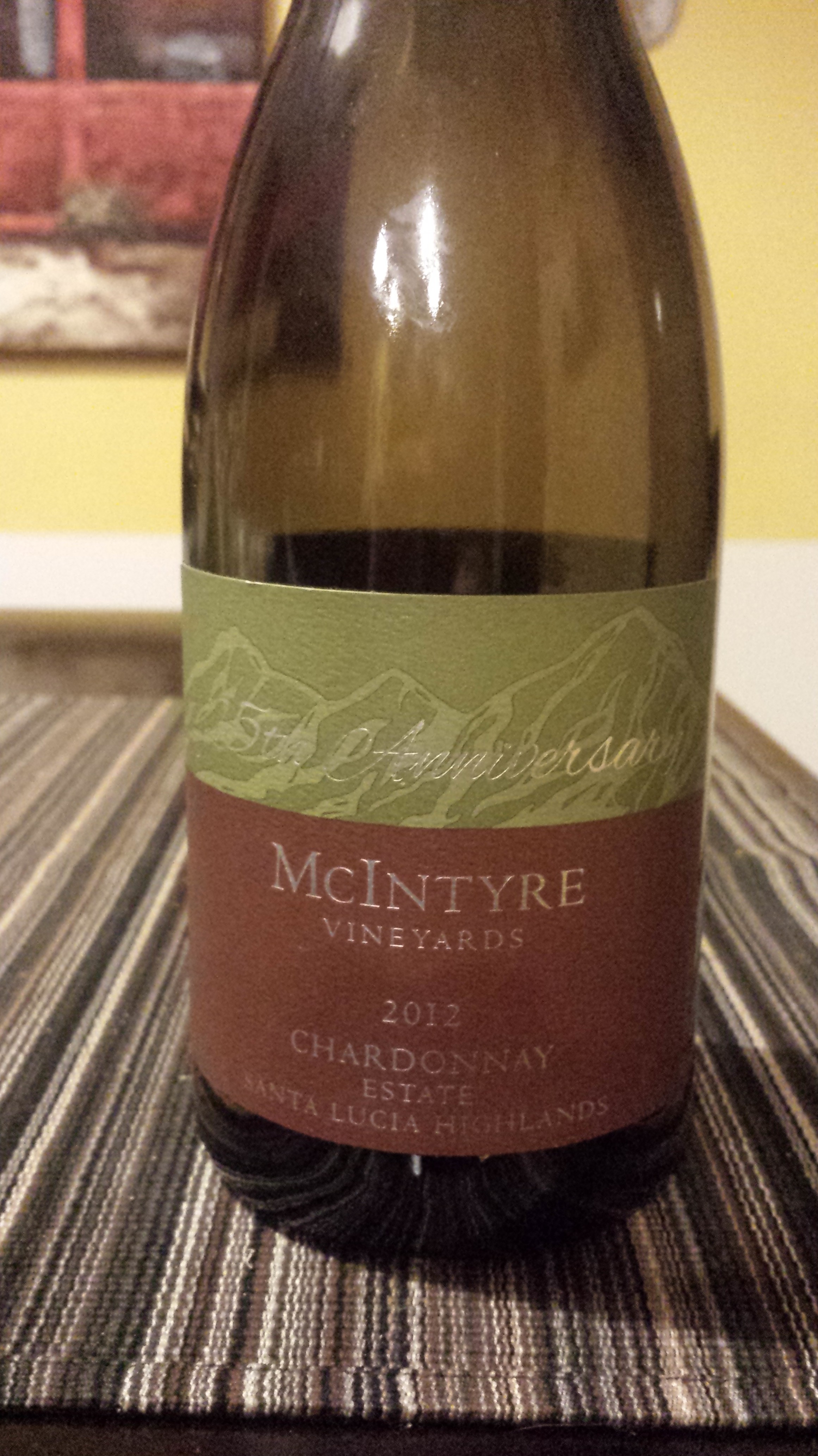 My Review: Â If you’ve read more than a handful of my reviews, you know that Chardonnay is a hot topic in my house. Not because I don’t enjoy it, quite the opposite in fact, but because of my wife’s preferences in the grape. For years she thought she just flat out didn’t like – an acceptale response as I don’t expect every person to like every type of wine. It turns out, however, that it’s not that she doesn’t like Chardonnay, only that she doesn’t like Oaked Chardonnay – which of course the 2012 McIntyre Vineyards Estate Chardonnay is; aged in new Siruge French oak barrels for 8 months.