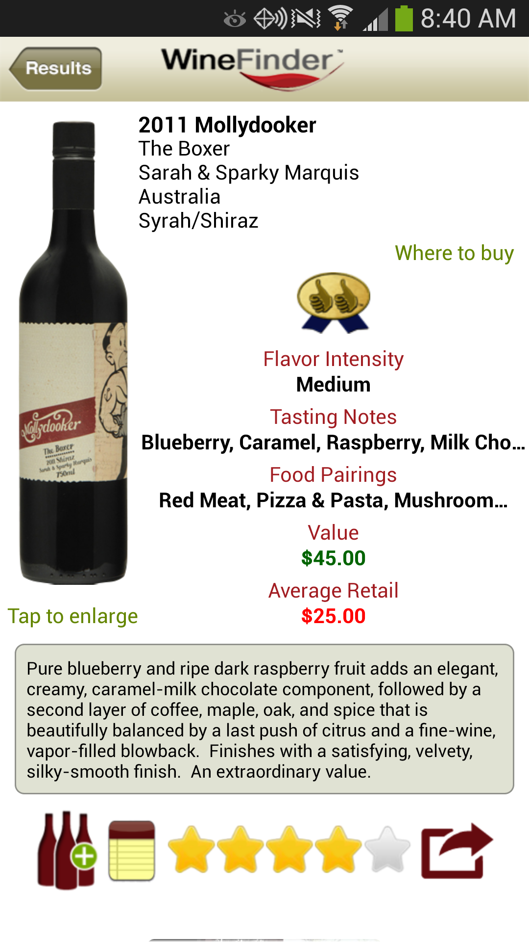 While the free version of the app will help you find wines at your local store, if you’re like me and keep track of just about every bottle you buy, the paid version will definitely appeal to you. By upgrading to the paid version you’re able to add wines to a “My Wine” section that allows you to rate the wines, add notes, and keep track of what you’ve purchased. Here’s a bottle that I’ve already grabbed using the app (review to come later, but short version, it was really good).